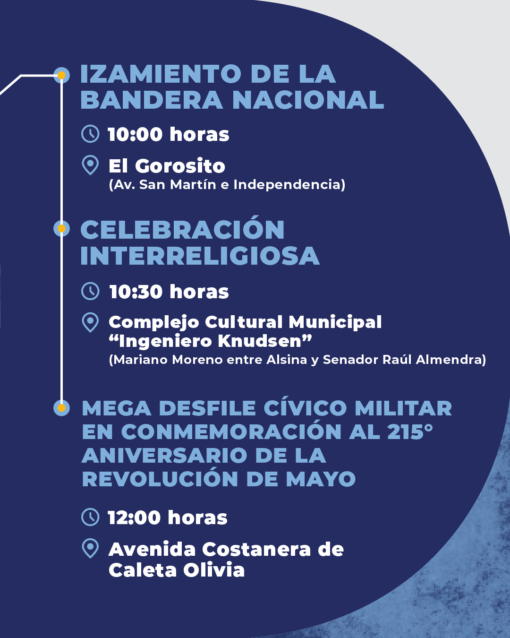 El próximo domingo 25 de mayo, Caleta Olivia será escenario del acto central por el 215° aniversario de la Revolución de Mayo, en un evento sin precedentes para la zona norte de Santa Cruz.