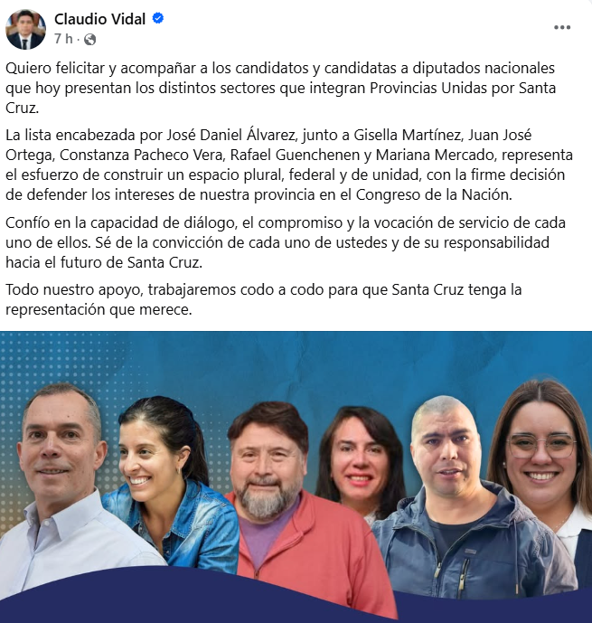 El gobernador Claudio Vidal respaldó desde sus redes sociales a la lista de candidatos a diputados nacionales que presentaron los distintos sectores que integran el frente Provincias Unidas por Santa Cruz, de cara a las elecciones legislativas de octubre.